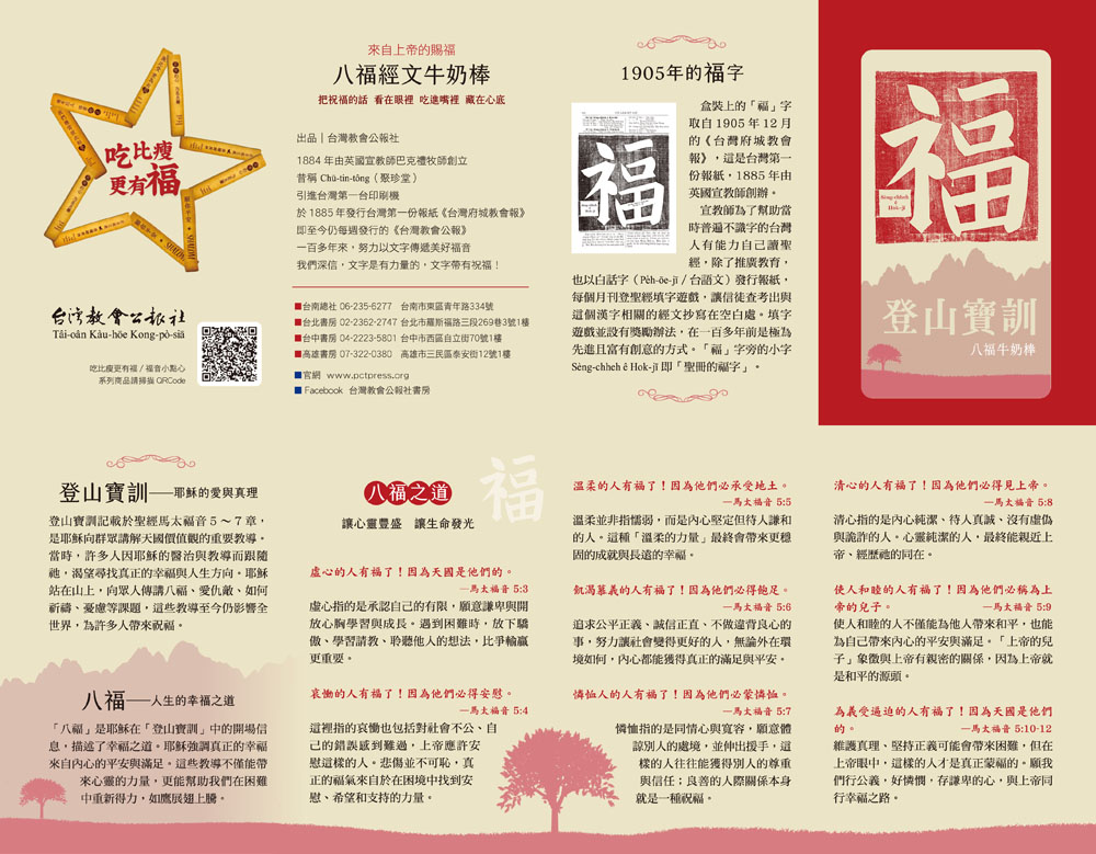 - 附登山寶訓小冊,介紹「登山寶訓」及「八福」的意義