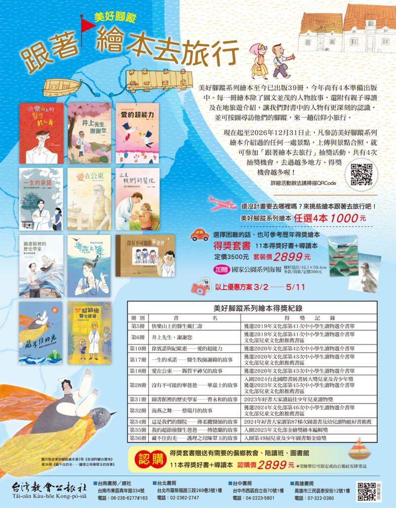 即日起至2026年12月31日,凡參訪美好腳蹤系列繪本介紹過的任何一處景點,上傳與景點合照,就可參加「跟著繪本去旅行」抽獎活動,共有4次抽獎機會,去越多地方、得獎機會越多喔!